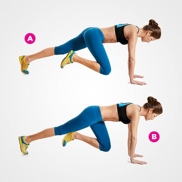 İlk ikisine göre biraz daha kompleks bir hareket olan Mountain Climber, karın kaslarını çalıştırırken kalori yakmayı sağlıyor. Başlangıç duruşu olarak şınav pozisyonunu alın. Karnınızı içinize çekerek sağ ayağınızı kaldırın ve sağ dizinizi yavaşça göğsünüze doğru çekin (A). Hareketi yaparken kalçanızı ve sırtınızı düz tutmaya dikkat edin. Sağ ayağınızı yerine koyup, aynı hareketi bir de sol ayağınızla tekrar edin (B).