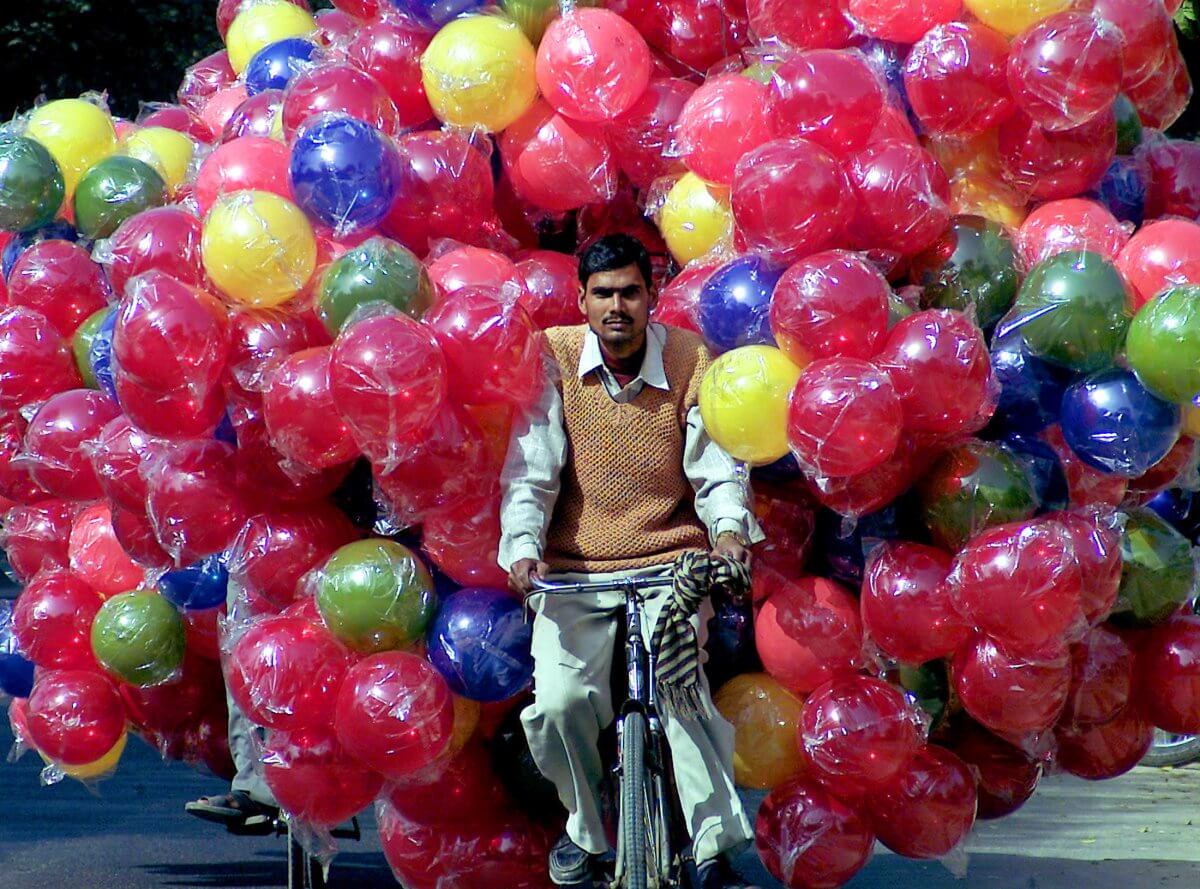 Daha önce hiç bisikletli baloncu görmüş müydünüz? Onlarca balonu dengesi bozulmadan taşıdığı için bu yetenekli baloncuyu ayakta alkışlıyoruz. Fotoğraf Hindistan’da çekilmiş.