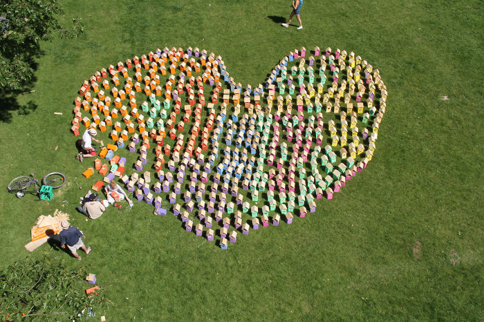 Bir festival kapsamında yapılmış bu 600 kuş yuvası, festival sonrası isteyenlere dağıtılmış. Kuş yuvası verilen kişilerden yuvayı astıkları yerin bir fotoğrafı istenmiş.