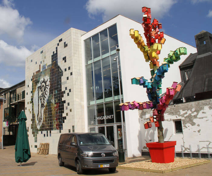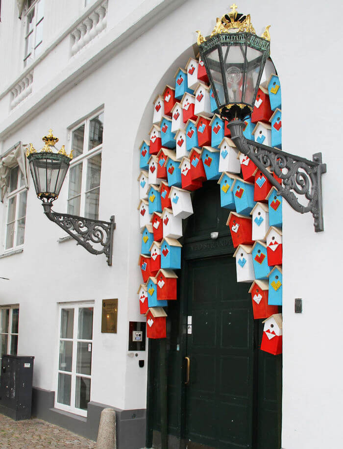 Kopenhag’da Kuzey Avrupa ülkelerinin bayraklarından ilham alarak yaptığı dekoratif kuş yuvaları… Yuvaların her biri çıkma tahtalardan yapılmış.